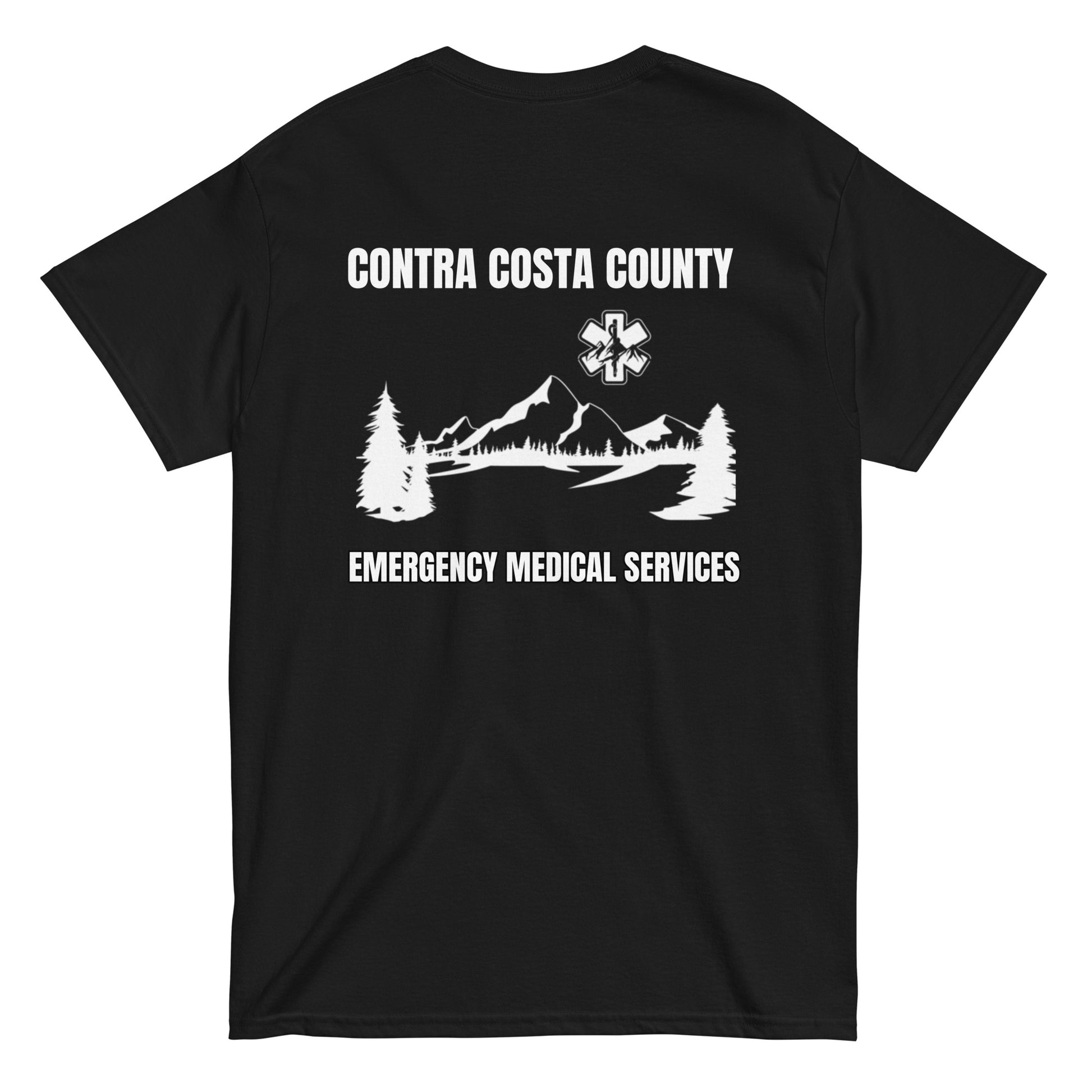 Graphic: The front of the shirt features a detailed silhouette of Mount Diablo, symbolizing the strength and resilience of our EMS teams. The EMS cross is prominently displayed, merging seamlessly with the mountain design to represent the unity of our services.